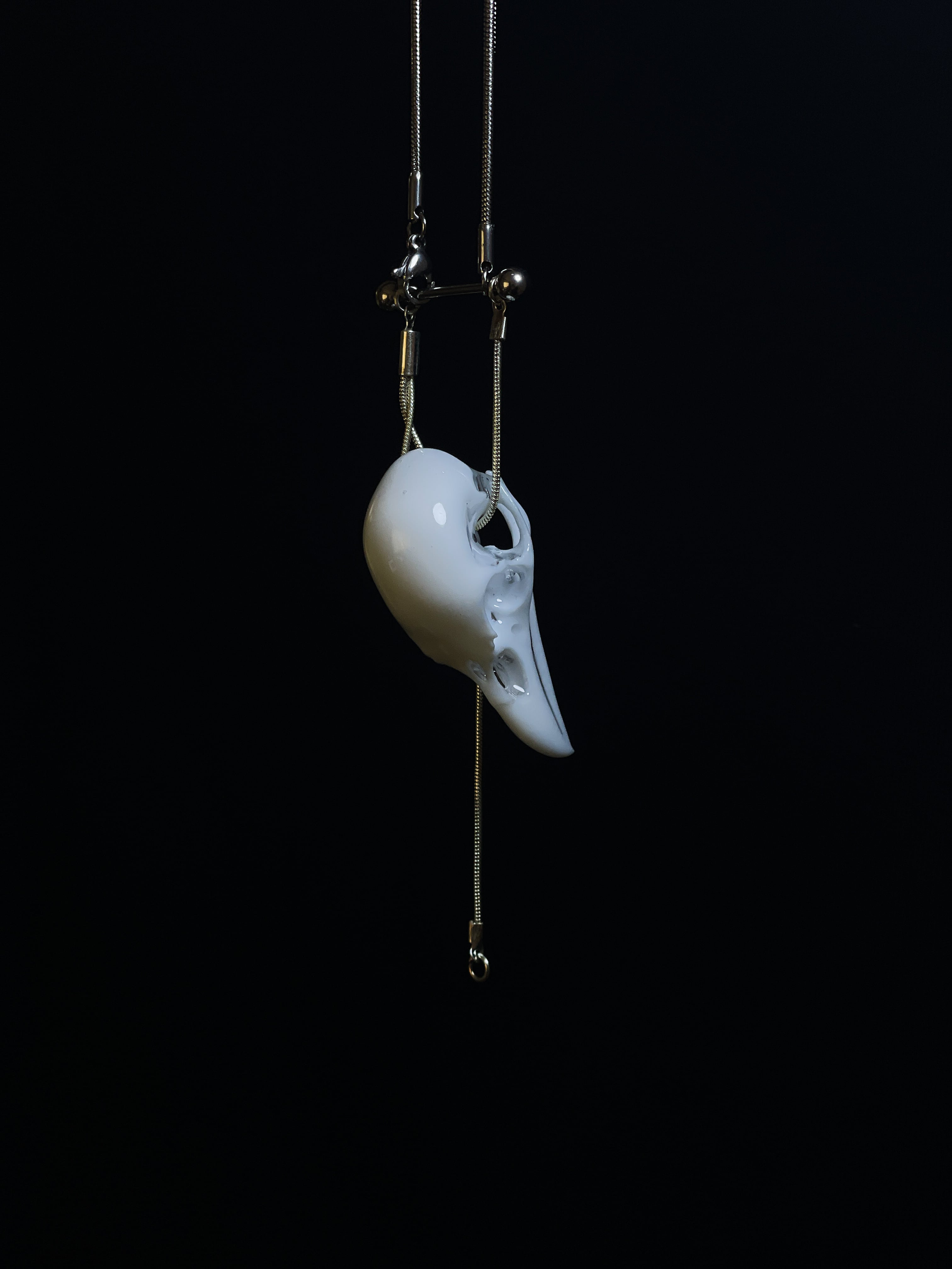 透明な液体から硬化し、職人の手作業によって研磨・改造・設計・加工された作品は、かつて海に存在したかもしれない“非生命的な骨格”を再構築したものです。石油から生まれた素材が、神聖さと死を模倣する。